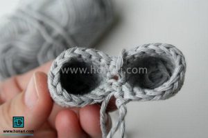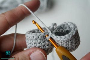 در دو حلقه بعدی، هر کدام یک پایه کوتاه بزنید. سپس در حلقه بعد، دو پایه کوتاه کار کنید. این الگو را تا انتهای رج ادامه دهید. در پایان این رج، باید در مجموع ۱۲ پایه کوتاه داشته باشید.