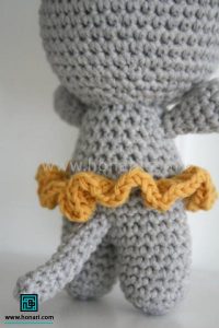 برای بخش دامن که با قلاب بافی انجام میشود، در رج پانزدهم، از پشت هر پایه، با یک رنگ جدید، پایه کوتاه بزنید.