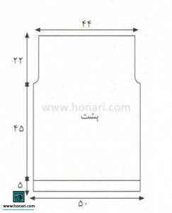 پشت کار را با رنگ طوسی شروع میکنیم. ابتدا ۹۶ دانه روی میل سر میاندازیم و حدود ۵۰ سانتیمتر به صورت بند جوراب میبافیم. بعد از آن، برای شکل دادن به سوراخ آستین، از یک طرف کار به ترتیب اول یک دانه، سپس دو دانه و در نهایت سه دانه را میبندیم (کور میکنیم). بعد از این مرحله، ۲۲ سانتیمتر دیگر به بافتن ادامه میدهیم. در انتها، دانههای مربوط به سرشانه را به همان روشی که برای جلوی کار انجام دادیم، میبندیم.