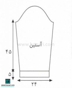 در این مرحله، به سراغ بخش آستین لباس میرویم. ابتدا باید الگوی آستین را که قبلاً آماده کردهاید، روی پارچه قرار دهید. دقت کنید که جهت پارچه (راستای قالب) را حتماً رعایت کنید تا آستین درست و حسابی شکل بگیرد.