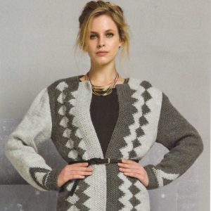با نخ طوسی سوپرلانا میدی، ۴۸ دانه سر بیندازید و ۵ سانتی متر به روش جودانه ببافید. سپس با نخ طوسی روشن، ۱۲ دانه جودانه ببافید، بعد ۲۱ دانه را مطابق نقشه پیش ببرید و ۱۵ دانه باقیمانده را با نخ طوسی ساده ببافید. وقتی قد کار به ۵۰ سانتیمتر رسید، در رجهای رفت، برای قسمت آستین به ترتیب ۱، ۱، ۲ و ۳ دانه را کور کنید. هنگامی که قد بافت به ۶۱ سانتیمتر رسید، برای یقه، ۱۲ دانه کنار را به روش جودانه با نخ طوسی ادامه دهید و در همان حین، به ترتیب ۱، ۱، ۱، ۱، ۱ و ۳ دانه را کور کنید. وقتی قد بافت به ۶۵ سانتیمتر رسید، آن ۱۲ دانه جودانه را کور کنید. از کنار کار، از ۸ دانه جودانه، در هر رج رفت ۵ بار و هر بار ۱ دانه کور کنید و بافت یقه را به روش جودانه ادامه دهید. وقتی قد بافت به ۷۲ سانتیمتر رسید، از سمت حلقه آستین، دانهها را به صورت ۶، ۶ و ۶ دانه کور کنید.