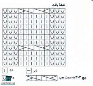 ۴ دانه رکن، ۶ دانه زیر، (هر ۱۲ رج یک بار ۳×۳ پیچ میدهیم)، ۳ دانه رکن، ۶ دانه زیر، ۳ دانه رکن، ۶ دانه زیر، ۴ دانه رکن.