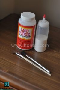 با استفاده از یک قلمو، یک لایه چسب دکوپاژ روی سطح لیوان بکشید. (اگر چسب دکوپاژ در دسترس نبود، میتوانید از چسب چوب بیرنگ که با کمی آب رقیق شده است هم استفاده کنید.)