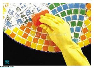 پس از گذشت حدود یک ربع، ملات اضافی روی کاشیها را با کمک یک ابر تمیز میکنیم.
