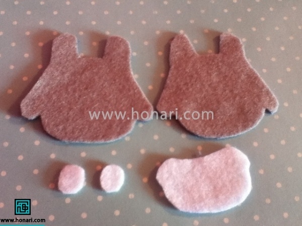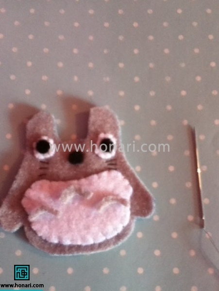 قطعههای مربوط به جلوی عروسک نمدیمان را در جای درست خود قرار میدهیم و سپس دورتادور آنها را با دقت و یکنواخت میدوزیم.