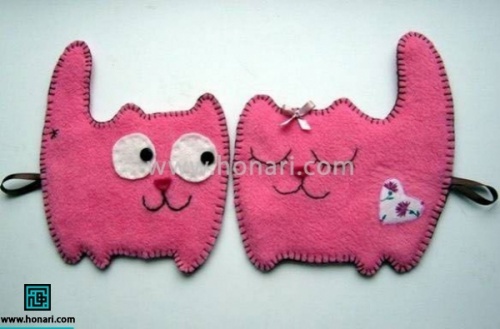 برای تزیین گربه‌های نمدی‌تان می‌توانید از پاپیون و پارچه‌های طرح‌دار استفاده کنید. همچنین با یک نوار روبان می‌توانید عروسک خود را به یک آویز تبدیل کنید. یادتان باشد تمام این تزیینات را باید قبل از دوختن لبه‌های گربه به آن اضافه کنید.