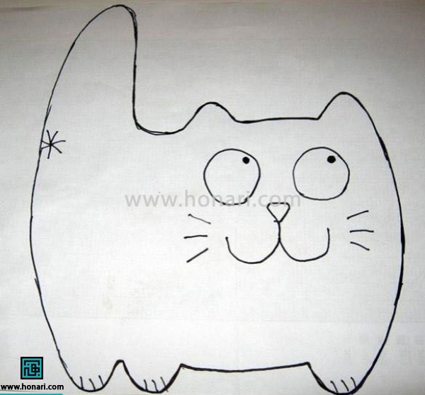 الگوی عروسک گربه را پرینت بگیرید و سپس با استفاده از مداد صابونی، شکل آن را روی پارچه‌ی نمدی خود بکشید.