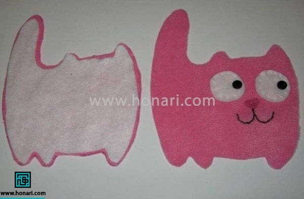 در مرحله بعد، نقشه گربه را روی نمد قرار داده و به دقت آن را ببرید. سپس، قطعات مربوط به چشم و بینی را با استفاده از چسب حرارتی در جای مناسب خود محکم کنید. برای قسمت دهان گربه، از دوخت استفاده کنید تا کامل شود.