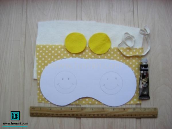 قسمت جلوی چشم‌بند را روی پارچه نمدی سفید برش می‌دهیم و دایره‌های زرد رنگ را مطابق شکل، در محل مشخص شده قرار می‌دهیم.
