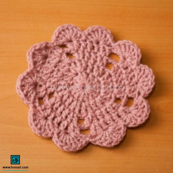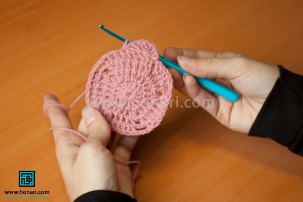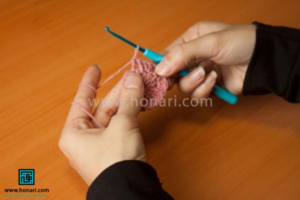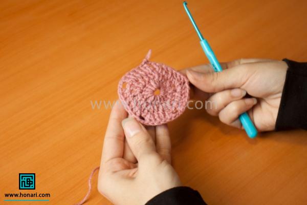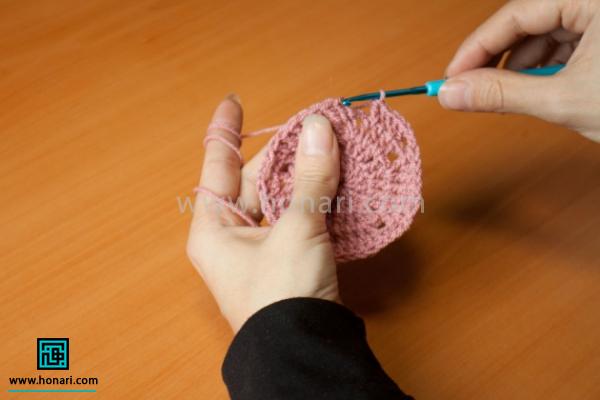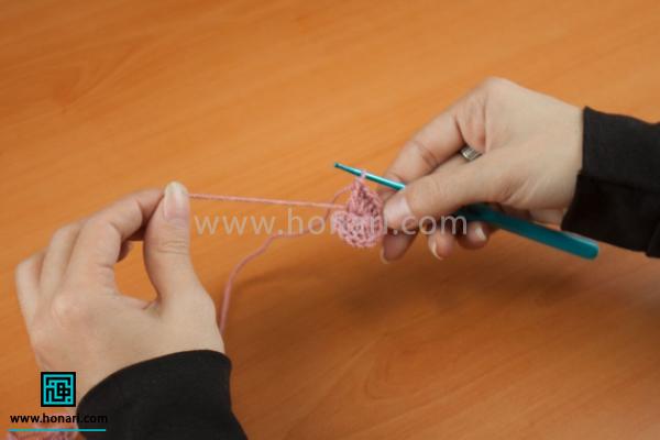 ردیف دوم: در یک حلقه، دو عدد پایه ببافید. سپس در حلقه بعدی، یک پایه بلند بزنید. بعد از آن، دوباره در یک حلقه، دو عدد پایه ببافید. حالا یک زنجیره بزنید. این الگو را تا پایان ردیف ادامه دهید.