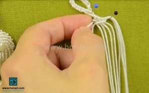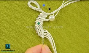 در انتها، نگین قفل دستبند را سر جایش قرار میدهیم و سپس سه گره مربعی شکل میزنیم.