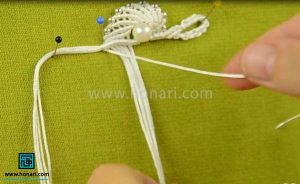 طبق روشی که گفته شد، قسمت پایین مهره را میبافیم. سپس همین کار را تا آخر دستبند ادامه میدهیم.
