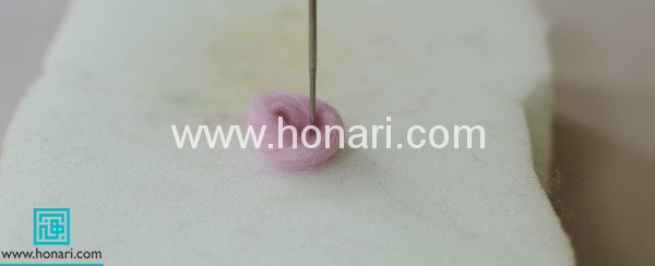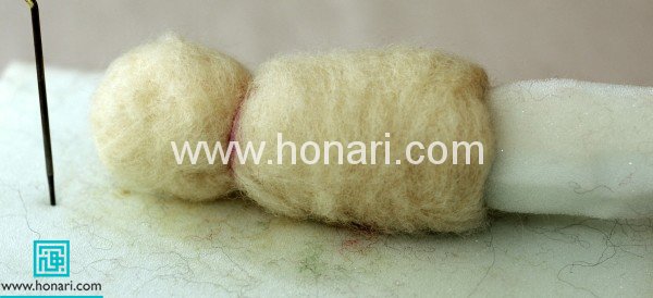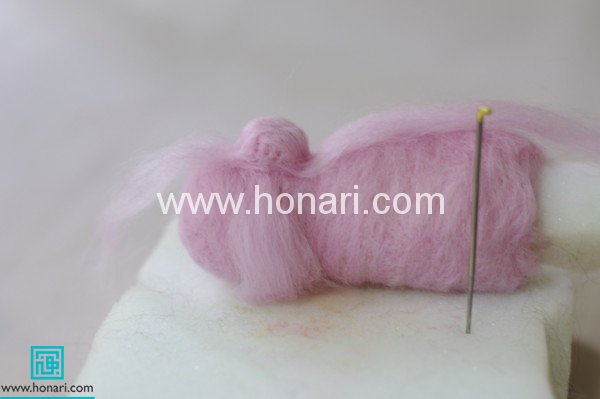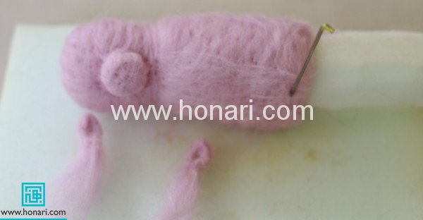 در خط فرضی یک‌سوم، با سوزن‌زنی قسمت گردن را ایجاد می‌کنیم. سپس تمام سطح قالب به دست آمده را با الیاف صورتی رنگ و از طریق سوزن‌زنی می‌پوشانیم.