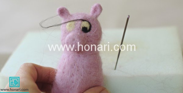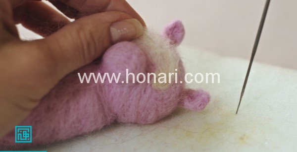 صورت خوک را روی بینی قرار داده و با کمک سوزن و کمی پشم اضافی، آن را به خوبی ثابت و محکم کنید.