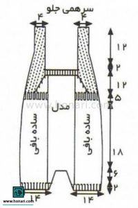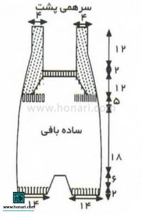 بعد از بافت کشباف، از هر دو طرف، 15 دانه را به صورت یکی زیر و یکی رو میبافیم. سپس 15 دانه را به شکل ساده بافته و 30 دانه وسط را مطابق الگوی داده شده ادامه میدهیم. در حین کار، پس از هر ۶ رج، قبل و بعد از آن ۱۵ دانه ساده، ۳ دانه را با هم یکی میکنیم (کور میکنیم). این کاهش را ۷ بار تکرار میکنیم تا در نهایت آن ۱۵ دانه کاملاً تمام شود. پس از آن، دانههای بخش وسط را به اندازه ۱۲ سانتیمتر به صورت بافت کشباف (یکی زیر، یکی رو) ادامه داده و سپس تمام دانهها را میبندیم. همچنین، ۱۵ دانه کناری را برای بخش سرشانه به اندازه ۱۲ سانتیمتر بافته، روی سرشانهها یک جا دکمه ایجاد کرده و در پایان همه دانهها را میبندیم.