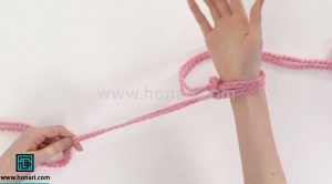 حلقه‌ای که درست کرده‌اید، حالا با دست راستتان بردارید. سپس این حلقه را از سمت داخل، دور شست دست چپ خود بیندازید.