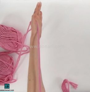 یک قسمت از کاموا را اندازه‌گیری کنید. برای این کار، طولی معادل شش برابر فاصله بین مچ دست تا آرنجتان در نظر بگیرید.