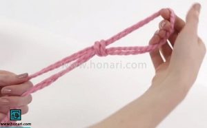اکنون نوبت بافتن است. نخ را با دست راست خود نگه دارید. یکی از دانه‌هایی که از ابتدا اضافه کردید را از دستتان خارج کنید.