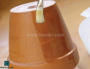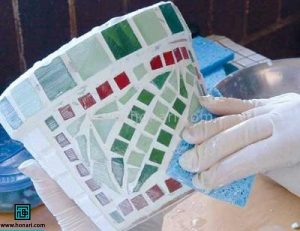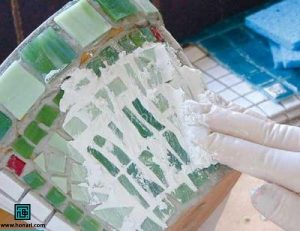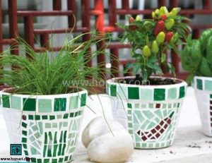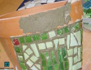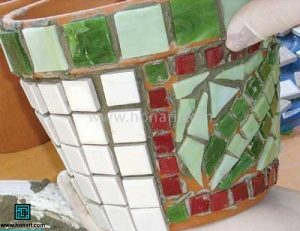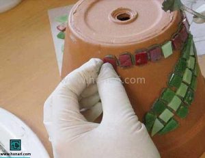 سپس قطعات کاشی را مطابق نقشه و طرح از پیش تعیین شده، روی سطح گلدان میچسبانیم.