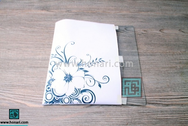 کاغذ کاربن را روی سطح شیشه قرار می‌دهیم و سپس کاغذ الگو را روی کاغذ کاربن می‌گذاریم.