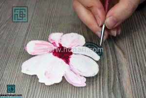 ابتدا با دقت رنگ صورتی ویترای را در مرکز گل قرار می‌دهیم و آن را به آرامی به سمت گلبرگ‌ها هدایت می‌کنیم. سپس با استفاده از رنگ سفید، سطح گلبرگ‌ها را به طور کامل می‌پوشانیم.