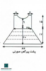 پشت لباس: ابتدا ۱۰۰ دانه سر میاندازیم و قسمت پایین (دامن) را مانند قسمت جلو میبافیم. پس از آن، طبق نقشه پیش میرویم. وقتی قد بافت به ۲۰ سانتیمتر رسید، برای ایجاد چاک در پشت لباس، دانهها را از وسط به دو قسمت مساوی تقسیم میکنیم و از این مرحله، هر قسمت را جداگانه میبافیم.