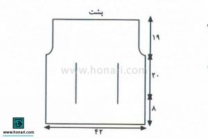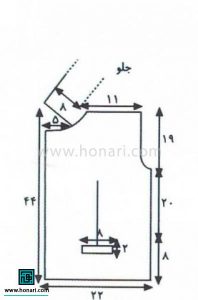 وقتی قد بافت به ۴۴ سانتی‌متر رسید، برای ایجاد گودی یقه، از یک سمت کار ابتدا ۳ دانه، سپس ۴ دانه، و بعد ۵ دانه را کور کنید. هنگامی که قد کار به ۴۷ سانتی‌متر برسد، دانه‌های مربوط به سرشانه را کور کنید.