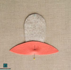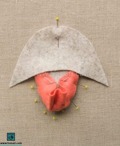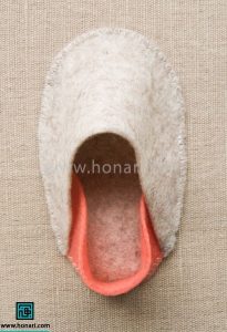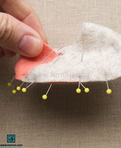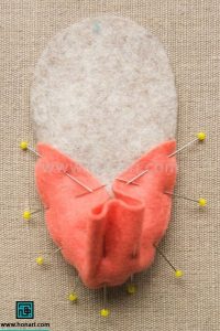 یک تکه از پشت کفش نمدی را با کمک سوزن، طوری که در تصویر میبینید، به کف آن وصل میکنیم.