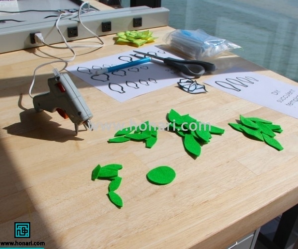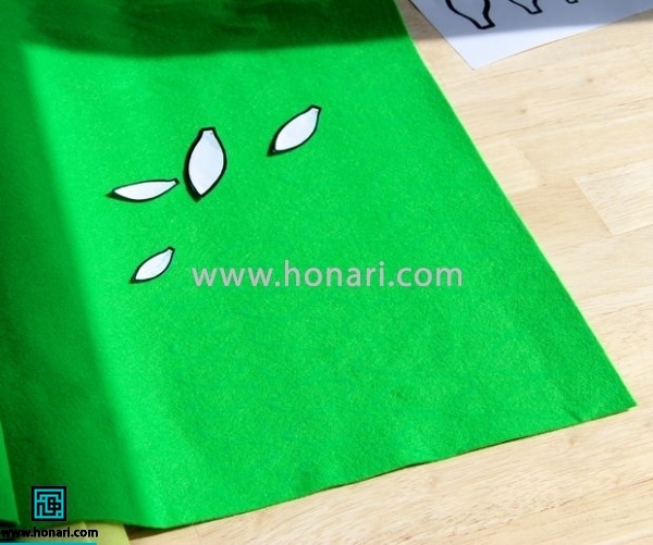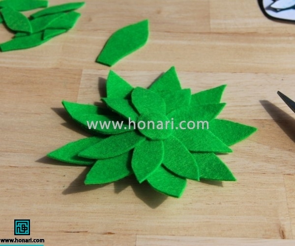 پس از اتمام کار روی برگ‌ها، یک دایره از همان نمد رنگی بریده و در وسط کار قرار می‌دهیم و می‌چسبانیم.