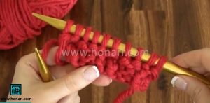 در مرحله سوم، بافت را برعکس انجام دهید. یعنی حلقه‌هایی که در رج قبلی به صورت زیر بافته شده‌اند، این بار به صورت رو ببافید و برعکس، حلقه‌های رو را به صورت زیر ببافید.