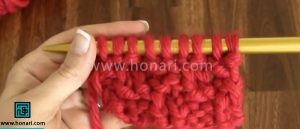 رج بعد را دقیقاً مانند حالت فعلی ببافید: دانه‌هایی که رو هستند، رو ببافید و دانه‌هایی که زیر هستند، زیر ببافید.