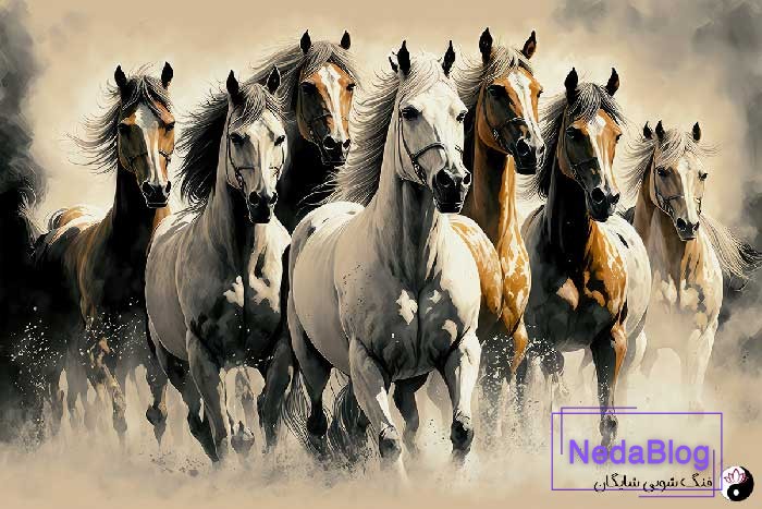 در فنگ شویی، نقاشی هفت اسب در حال دویدن، نمادی خوش‌یمن محسوب می‌شود و باور بر این است که به ثبات مالی و پیشرفت در زندگی کمک می‌کند. اگر قصد دارید کسب‌وکار خود را گسترش دهید یا سرمایه‌گذاری جدیدی شروع کنید، گذاشتن تصویر هفت اسب در محیط کار پیشنهاد می‌شود. نماد اسب به طور کلی تأثیر خوبی بر روابط کاری و شخصی می‌گذارد. این نماد معمولاً در شرکت‌ها برای جذب موفقیت و فرصت‌های تجاری، به ویژه در قسمت جنوب شرقی فضا نصب می‌شود. همچنین، دو اسب در کنار هم، نشان‌دهنده پیوند عمیق و رابطه‌ای پایدار مانند ازدواج است.