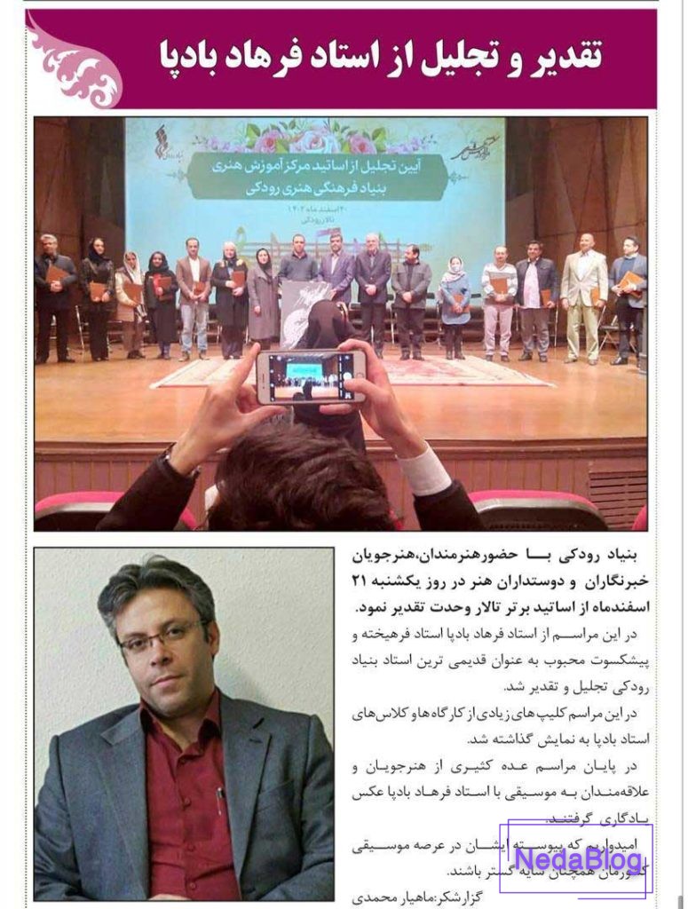 در مراسم بزرگداشت اساتید مرکز آموزش هنری بنیاد فرهنگی هنری رودکی، جمعیت زیادی از هنرجویان، خبرنگاران و علاقهمندان به هنر شرکت کردند. در این برنامه از استاد فرهاد بادپا، به عنوان استاد پیشکسوت و با سابقهی بنیاد رودکی، قدردانی شد.